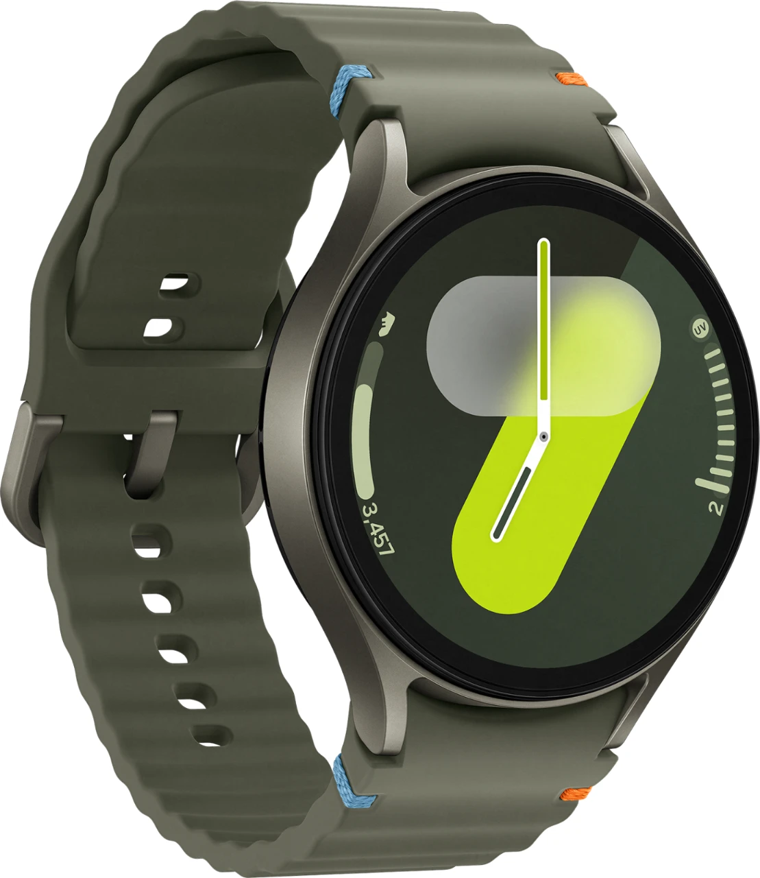 Obwohl die Galaxy Watch7 vollgepackt ist mit vielseitigen Funktionen, liegt ihr Aluminium Gehäuse angenehm flach und leicht an deinem Handgelenk. Zeitlos schön und dennoch voll im Trend sind die natürlichen Farbvarianten Green und Cream beim 40-mm-Modell sowie Green und Silver beim 44-mm-Modell. Runde deinen persönlichen Favoriten mit der großen Auswahl an einfach wechselbaren Armbändern ab. Damit kannst du deine Galaxy Watch7 zu deinem perfekten Begleiter beim Workout, in deiner Freizeit oder auf der nächsten Party machen. Und rund um die Uhr von der intelligenten Galaxy AI-Power an deinem Handgelenk profitieren.